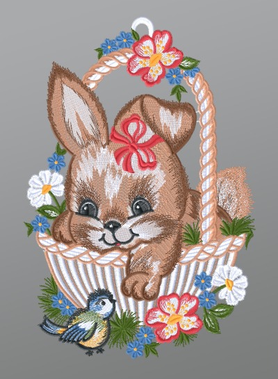 34,25 CHFFensterbild aus Plauener Spitze® - Kleine Häsin in Osterkörbchen #1W mehrfarbig