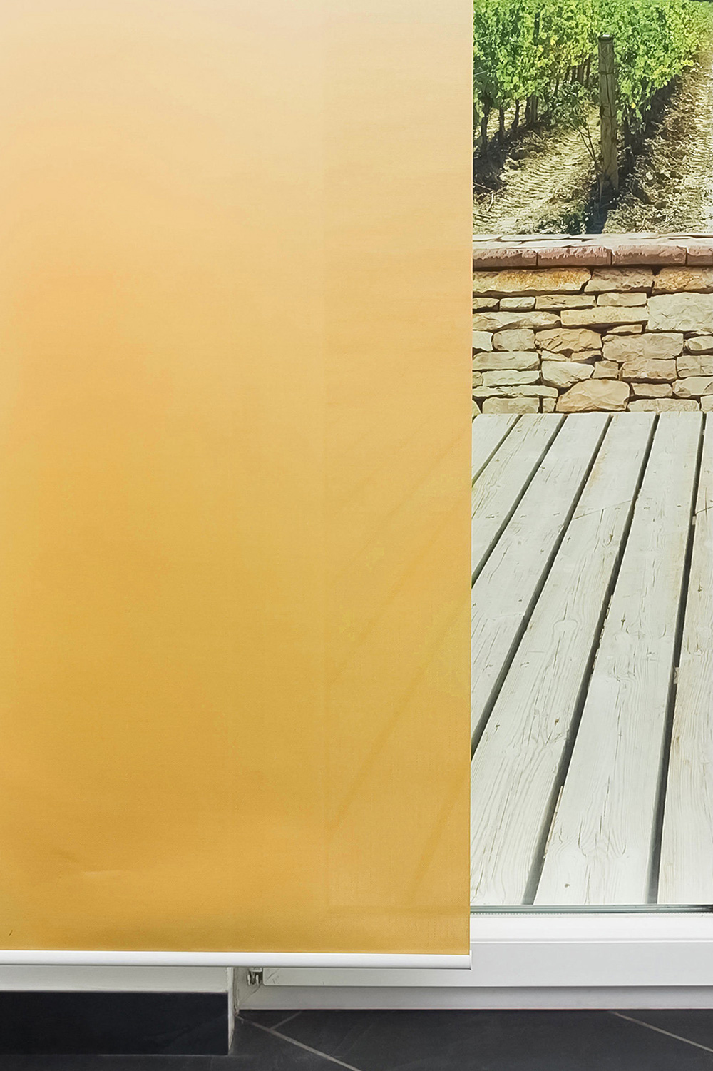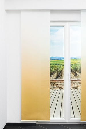 Eine ausgesprochen wirkungsvolle Fenstergestaltung bietet dieses Design mit ganzflächigem Farbverlauf. Oben weiss und unten farbig, hat dieser Farbverlauf insgesamt eine Höhe von 280 cm. Die Konfektionierung wird jeweils von unten, also vom farbigen Bereich aus vorgenommen. Der robuste, leinenartig gewebte Stoff ist leicht durchsichtig und lichtdurchlässig und in 6 kräftigen Trendfarben wählbar. Der Farbverlauf ist von innen aufgedruckt und nur leicht von aussen sichtbar.