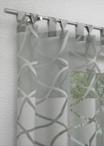 Hier ist der gesamte Stoff mit einem Muster in Ausbrenner-Optik gestaltet. Die halbtransparenten, geschwungenen Linien sind das entscheidende Designelement und nehmen die gesamte Oberfläche ein. Durch die Schnittpunkte gibt sich ein an ein geflochtenes Netz erinnerndes Design zu erkennen. Entfernt kann es auch an vom Wind bewegtes Wasser erinnern. Die unterschiedlichen Transparenzen lassen lebendige und ausdrucksstarke Effekte entstehen, die besonders bei einer Fensterdeko ihre ganze Wirkung entfalten. Nutzen Sie den Konfigurator, um beispielsweise ein Raffrollo oder einen Gardinenschal nach Mass individuell zusammenzustellen. Dabei können Sie auch Einfluss auf den oberen Abschluss, also die Aufhängung, nehmen. Als Tischdecke oder Tischläufer eingesetzt lässt dieses Modell die Oberfläche des Tisches bzw. die Optik des darunterliegenden Stoffes zum Vorschein kommen. Möchten Sie eigene kreative Ideen umsetzen, bestellen Sie die Meterware.