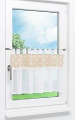 Die mit der schönen Bordüre am oberen Abschluss gestaltete Scheibengardine sorgt für eine wohnliche und einladende Atmosphäre. Das transparente Material und die feinen Blümchen-Stickereien machen diese Bistrogardine zu einer schönen Fensterdeko für den Frühling. Dabei befinden sich die Blümchen sowohl als Muster auf der andersfarbigen Bordüre und sie werden auch in deren Spitzenabschluss wieder aufgegriffen. Die breiten Schlaufen, die der Aufhängung dienen, heben sich schon aufgrund der farblichen Gestaltung von der Bordüre ab. Für die Verzierung der Küchenfenster eignet sich die Scheibengardine besonders gut.